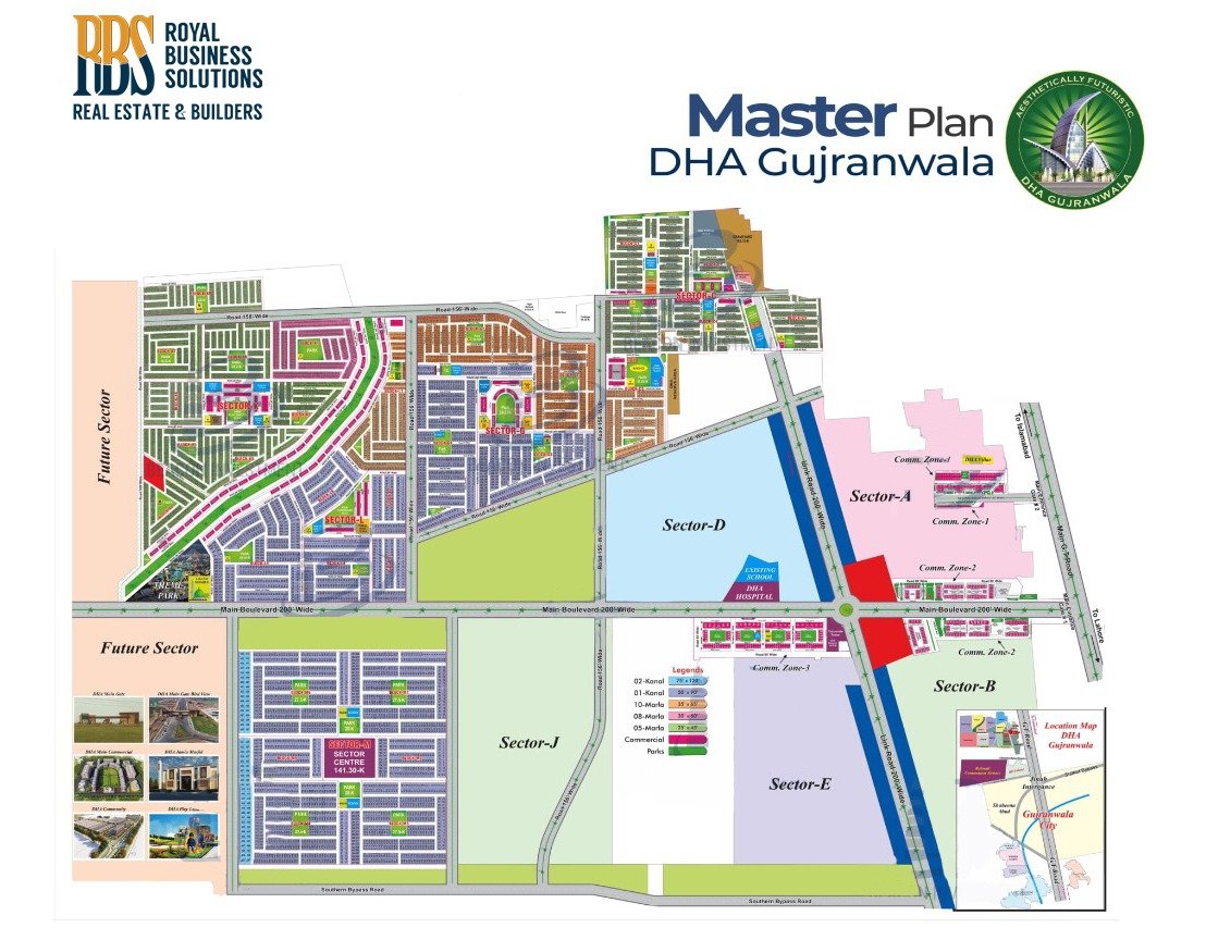DHA Gujranwala divides into residential and commercial sectors. According to the plan, it will have 700 feet wide main Boulevard and will divide into various sectors including; Sector A, Sector B, Sector C, Sector D, Sector E, and Sector G, Sector J, Sector K, Sector, L & Sector M. Also, there are Future Sector 1, Future Sector 2, Commercial Zone 1, Commercial Zone 2 North, Commercial Zone 2 South, and Commercial Zone 3.