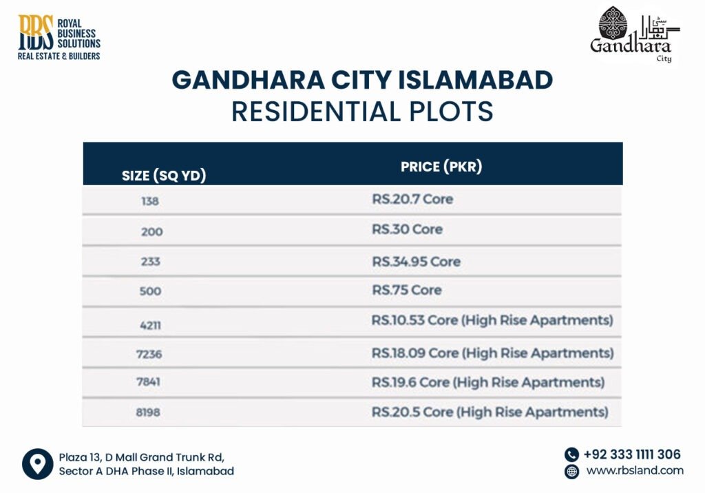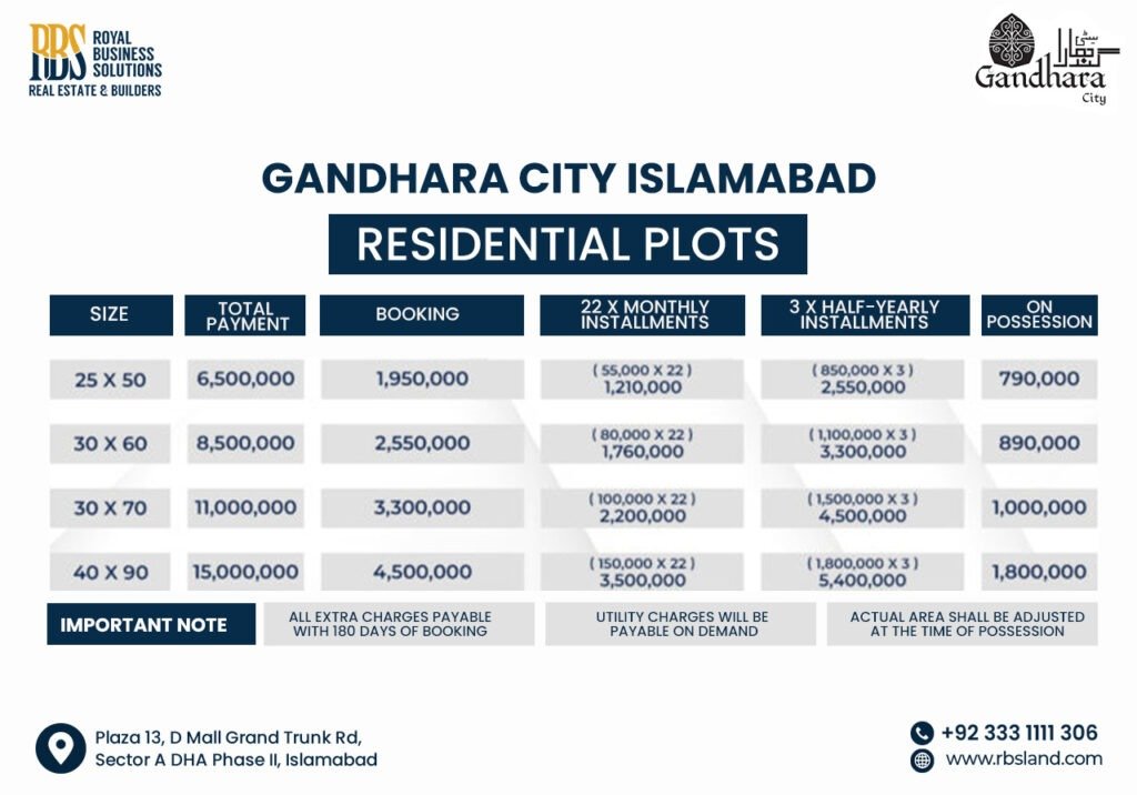 The city offers several plot sizes. The payment and installment plan vary depending on the plot size. Below is a list of the different types of residential and business plots in Gandhara City Islamabad.