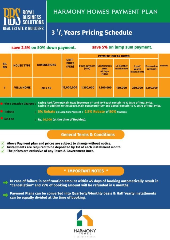 Our 3.5 Marla Harmony Homes tick all the boxes and are an ideal investment. Hurry up and don’t waste this golden opportunity to get ownership of your own space. Contact Us today to get an insight into the payment plan and any other queries.