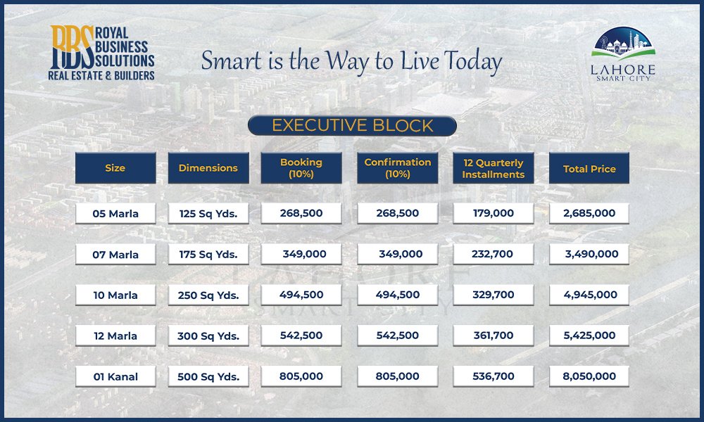 Lahore Smart City executive block mainly targets the local Pakistani residents. It is equipped with all basic as well as modern amenities that make people’s life easier. Moreover, residential plots available in the executive block are: