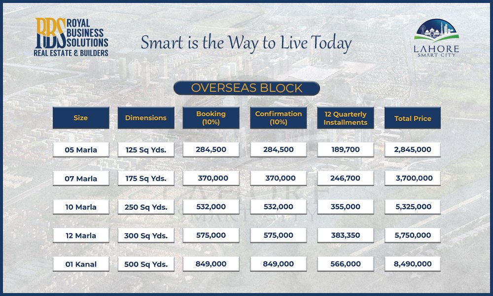 The overseas block of Lahore Smart City is specially designed for overseas Pakistanis. The purpose of this block is to meet the housing needs of a Pakistani living in abroad. Additionally, the block offers luxurious facilities to its residents at affordable rates. The following residential, as well as commercial plots, are offereing in Lahore Smart City overseas block.