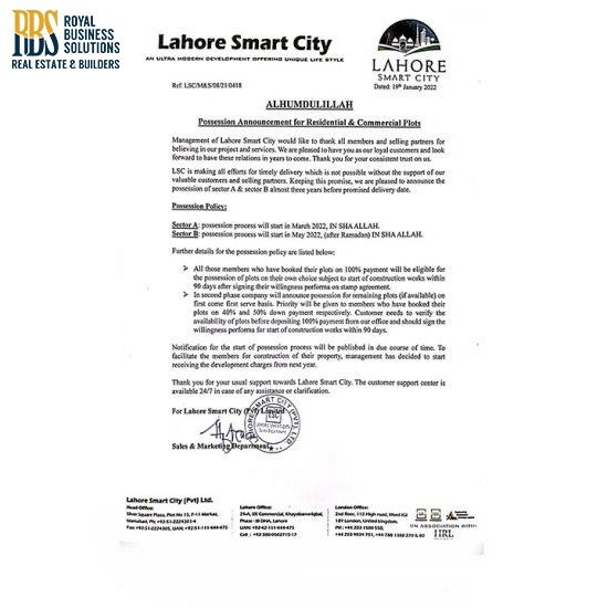 LSC will be built on 20,000 Kanals. In addition, the builders have finished a master plan for this housing society that will offer smart facilities of the highest international standards in a housing project that will be on par with other smart cities around the globe.