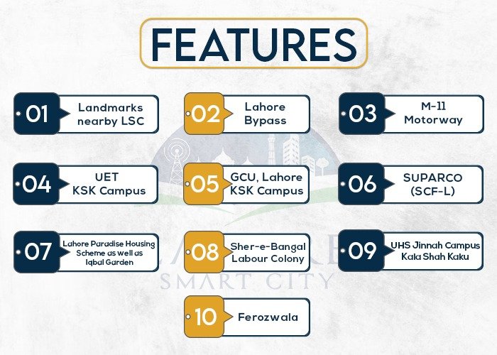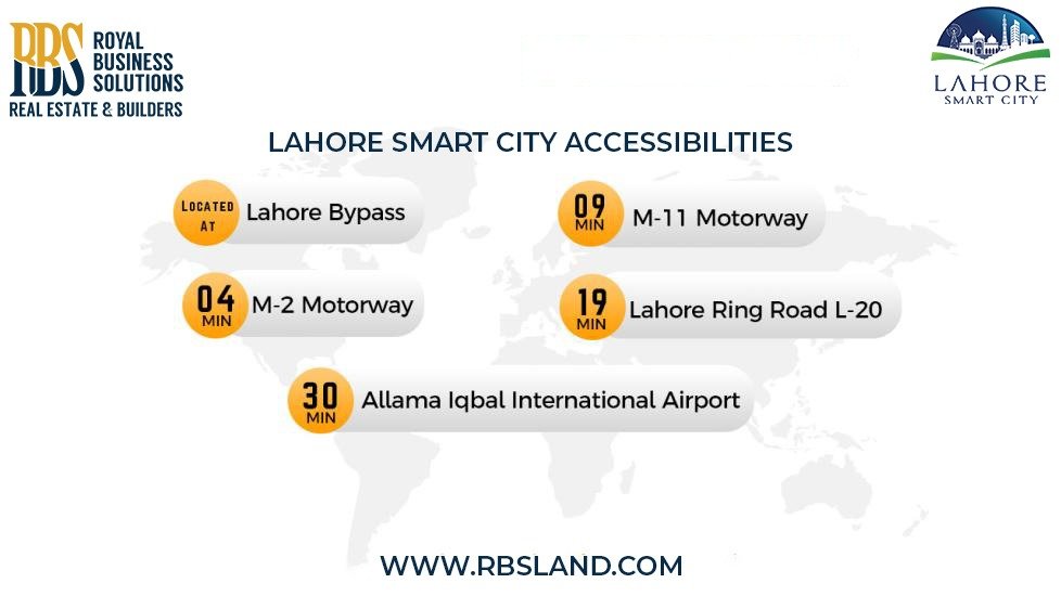 The location of Lahore Smart City is ideal and has multiple entry points. It is located on the bypass of Lahore, close to Ring Road, GT Road, Kala Shah Kaku, and the CPEC route. Schools, shopping centers, marketplaces, as well as food outlets encircle this housing community, making it simpler for you to meet your needs.
