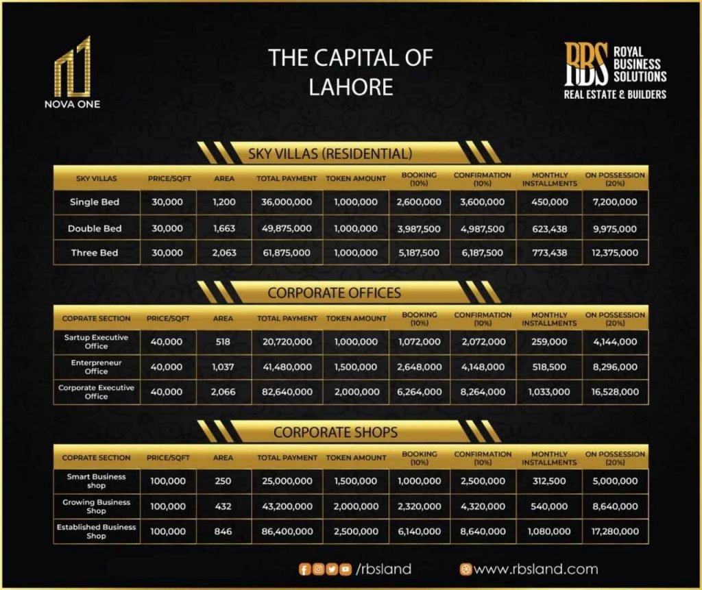 There are diversity of methods, according to the nature of your choice (Residential, Offices or Shops) so the installments on monthly basis, total payment as well as the how much you’ve to pay as a token amount given below inward the table. That is the best vision to give your family a lavish lifestyle and entire necessary facilities. Therefore, that would be the best opportunity to book residential in Nova One because it’s only starting from 2,600,000 booking (paying 10% of the total payment).