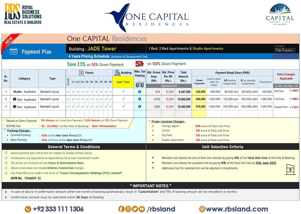 One Capital Residential Apartment prices start from 10,500 square ft. as well as they are planning for the project’s in a way that the; community to enable investors make sure they’re getting a good deal and to put their minds at ease regarding the One Capital Residences project. We’re expecting for the best in terms of price from Capital Smart City, since they’re known for providing their investors with the most economic options. The complete payment plan will be officially launch very soon. These apartments are expected to be the more economical over the Silver Oaks as well as Dean Apartments.