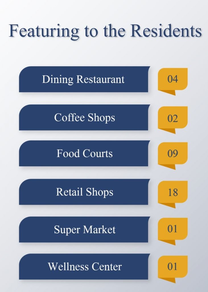 There is more than 130,000 square feet set out for retail, leisure and entertainment purposes alone. Everything from restaurants to supermarkets can be found in this modern neighborhood. Listed below are some of the commercial complex’s specifications.